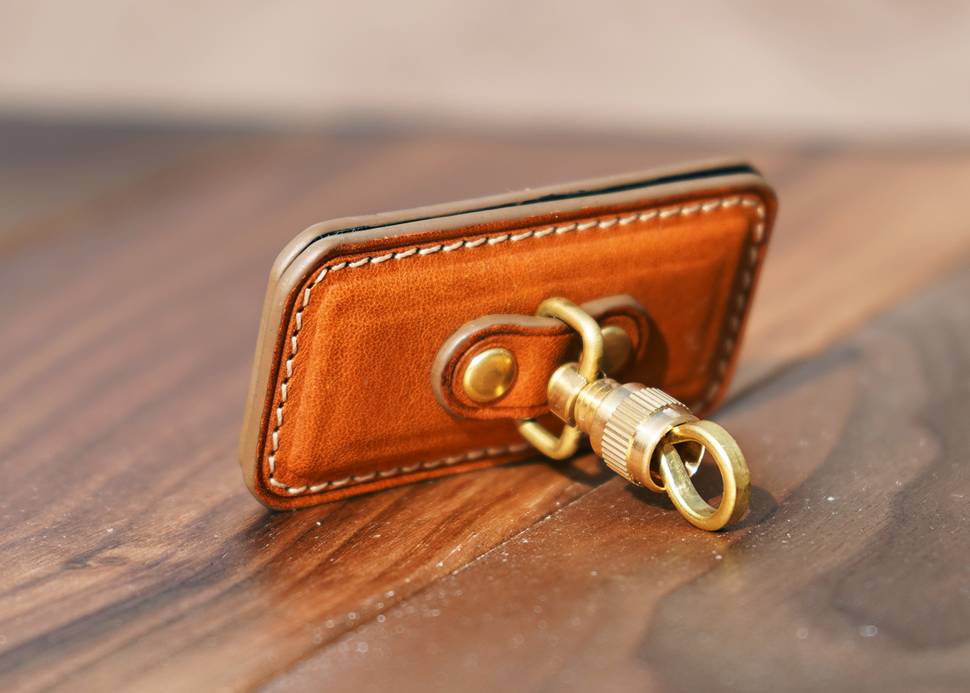 こ本革で包み込む究極のガストーチカバー。手縫いで施されたステッチは美しく、キャップ部分を外し金具をつける事で機能性を高めた。カラビナをつける事により携帯もしやすい。
